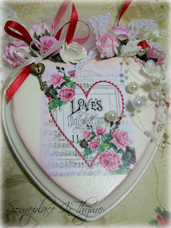 You can't have a love day without hearts and this wooden heart is just perfect for your cottage or shabby home decor. Made of wood and painted white, I distressed her a bit with different inks and then began to decorate. I think it's perfect.
